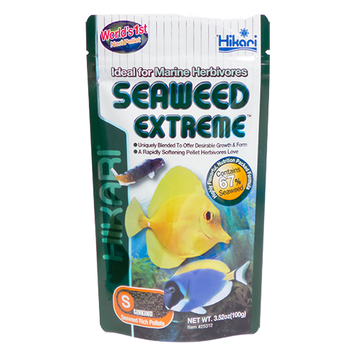 Hikari Seaweed Extreme is the world's first pellet designed for marine fish that offers an extreme amount of natural algaes, with an impressive 67% algae content. Say goodbye to messy seaweed strips - this highly nutritious pellet is eagerly consumed by herbivorous fish as soon as it enters the water. Let Hikari simplify feeding your marine herbivores and omnivores with their aromatic, fast softening wafers and pellets. This nutrient-packed supplement promotes rapid growth and supports immune system health, all while enhancing coloration. Perfect for most omnivorous species like clownfish, damsels, and butterflies.